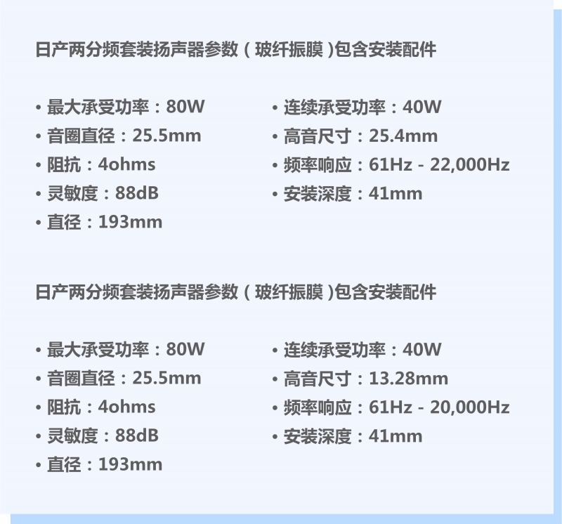 藍(lán)寶日產(chǎn)專車專用豪華配置,前門兩分頻套裝喇叭, 后門同軸喇叭,整個(gè)車間立體環(huán)繞,節(jié)奏感強(qiáng)烈 并且高端大氣、無損安裝、即插即用,整體層次感以及人聲的細(xì)膩度都表現(xiàn) 得淋漓盡致!