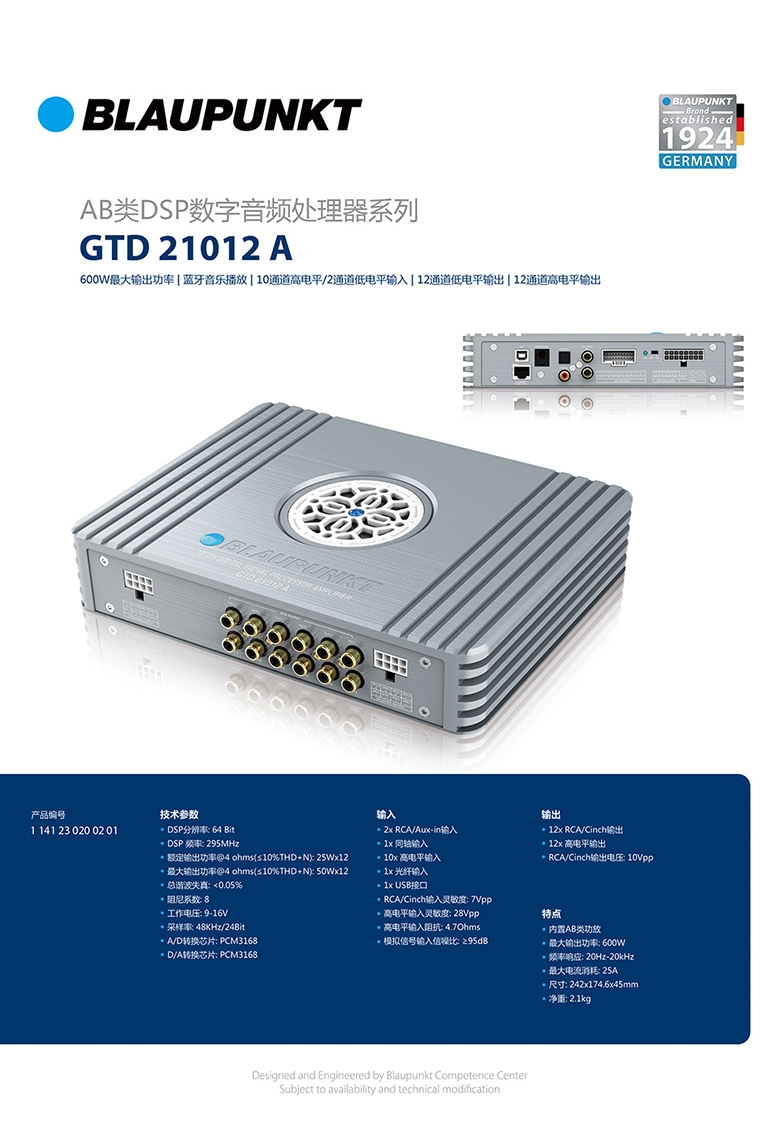 德國藍寶(BLAUPUNKT)大功率高清12路DSP功放 GTD 21012 A
